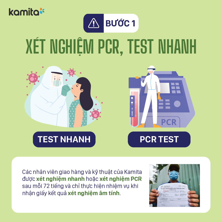 Các nhân viên giao hàng và kỹ thuật của Kamita được xét nghiệm nhanh hoặc xét nghiệm PCR sau mỗi 72 tiếng và chỉ thực hiện nhiệm vụ khi nhận giấy kết quả xét nghiệm âm tính.