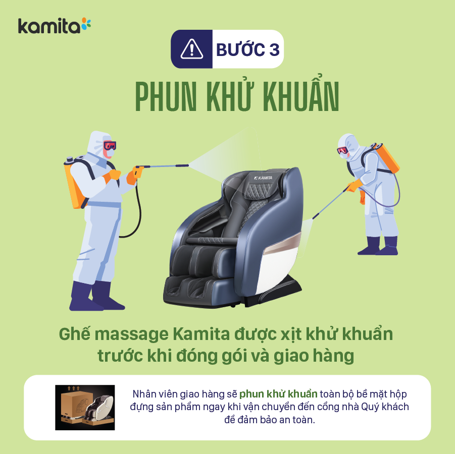 Ghế massage Kamita được xịt khử khuẩn trước khi đóng gói và giao hàng. Đồng thời, nhân viên giao hàng sẽ phun khử khuẩn toàn bộ bề mặt hộp đựng sản phẩm ngay khi vận chuyển đến cổng nhà Quý khách hàng để đảm bảo an toàn.