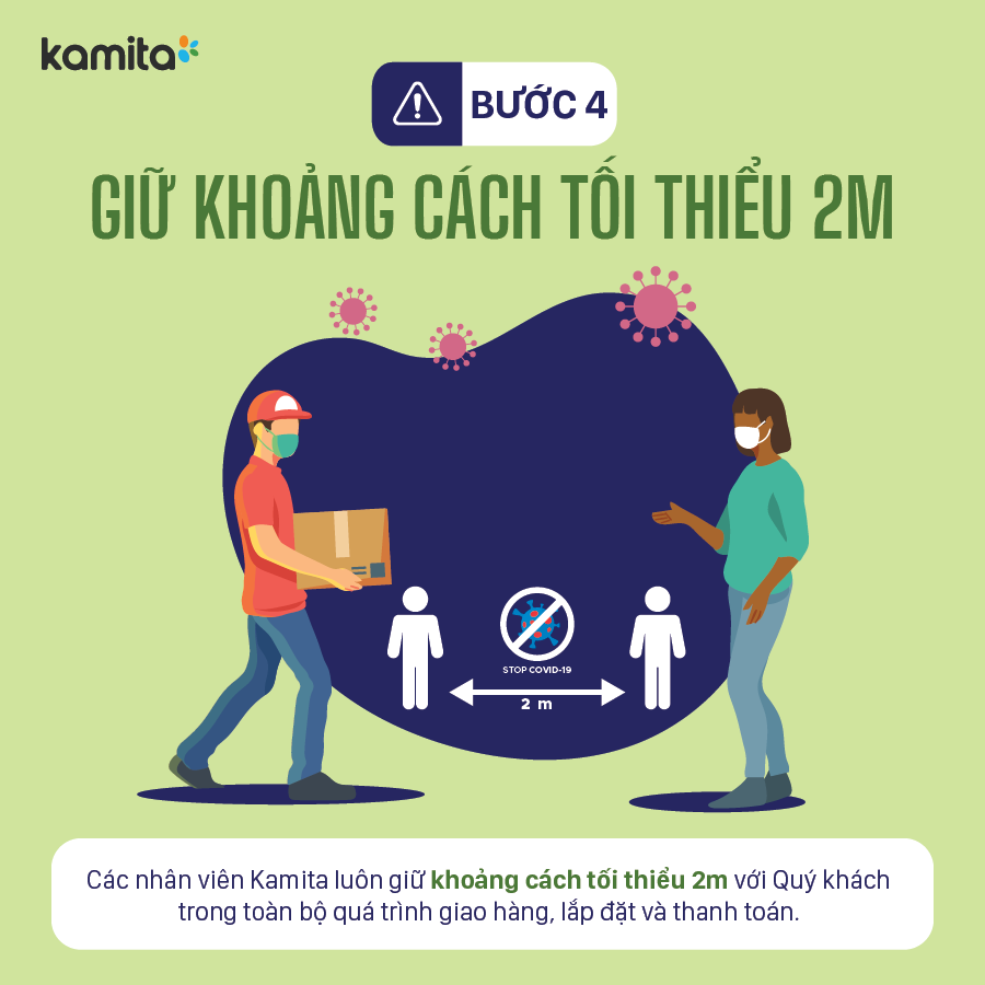 Các nhân viên Kamita luôn giữ khoảng cách tối thiểu 2m với Quý khách hàng trong toàn bộ quá trình giao hàng, lắp đặt và thanh toán.