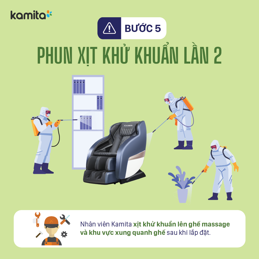 Nhân viên Kamita xịt khử khuẩn lên ghế massage và khu vực xung quanh ghế sau khi lắp đặt.