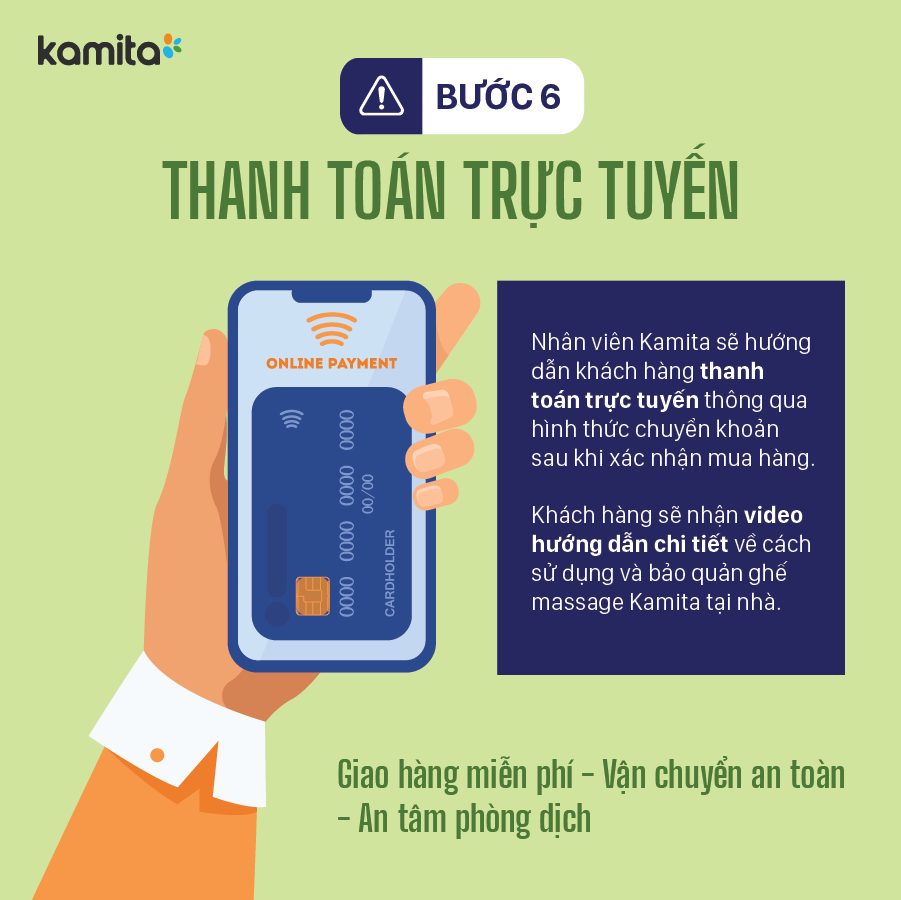 Nhằm hạn chế việc tiếp xúc tối đa, nhân viên Kamita sẽ hướng dẫn khách hàng thanh toán trực tuyến thông qua hình thức chuyển khoản sau khi xác nhận mua hàng. Đồng thời khách hàng sẽ nhận video hướng dẫn chi tiết về cách sử dụng và bảo quản ghế massage Kamita tại nhà.