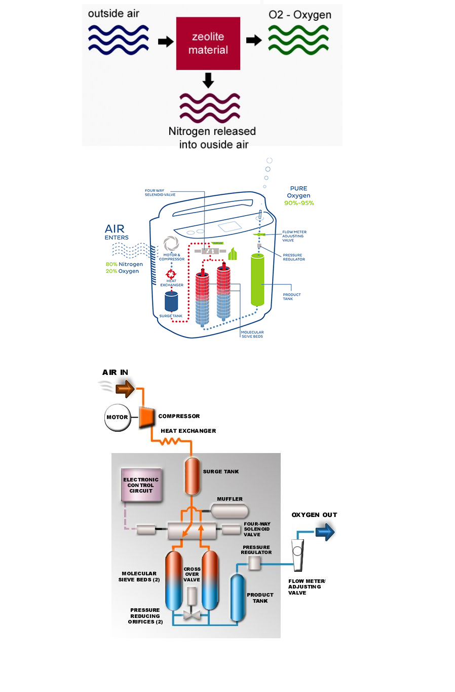 Theo đó, không khí được hút qua bộ lọc và dẫn đến máy nén khí (áp suất tại đây dao động khoảng 2-3 at). Máy nén khí làm mát không khí và đẩy chúng qua hệ thống van 4 chiều. Hệ thống này lần lượt đóng mở để dồn không khí nén vào bình. Đồng thời, máy đẩy khí nitơ trong bình molecular sieve bed ra bên ngoài và đẩy khí oxy vào bình tích áp chứa oxy. Quá trình này sẽ làm bình chứa hạt Zeolite giảm áp suất xuống một mức nhất định để van đóng đường nạp oxy và xả khí nitơ ra ngoài tái tạo hóa chất. Toàn bộ chu trình và thời gian đóng mở của van máy nén sẽ được điều khiển tự động bằng mạch điện tử, dựa trên những tính toán kỹ lưỡng về dung tích bình, lưu lượng cũng như áp lực khí,...