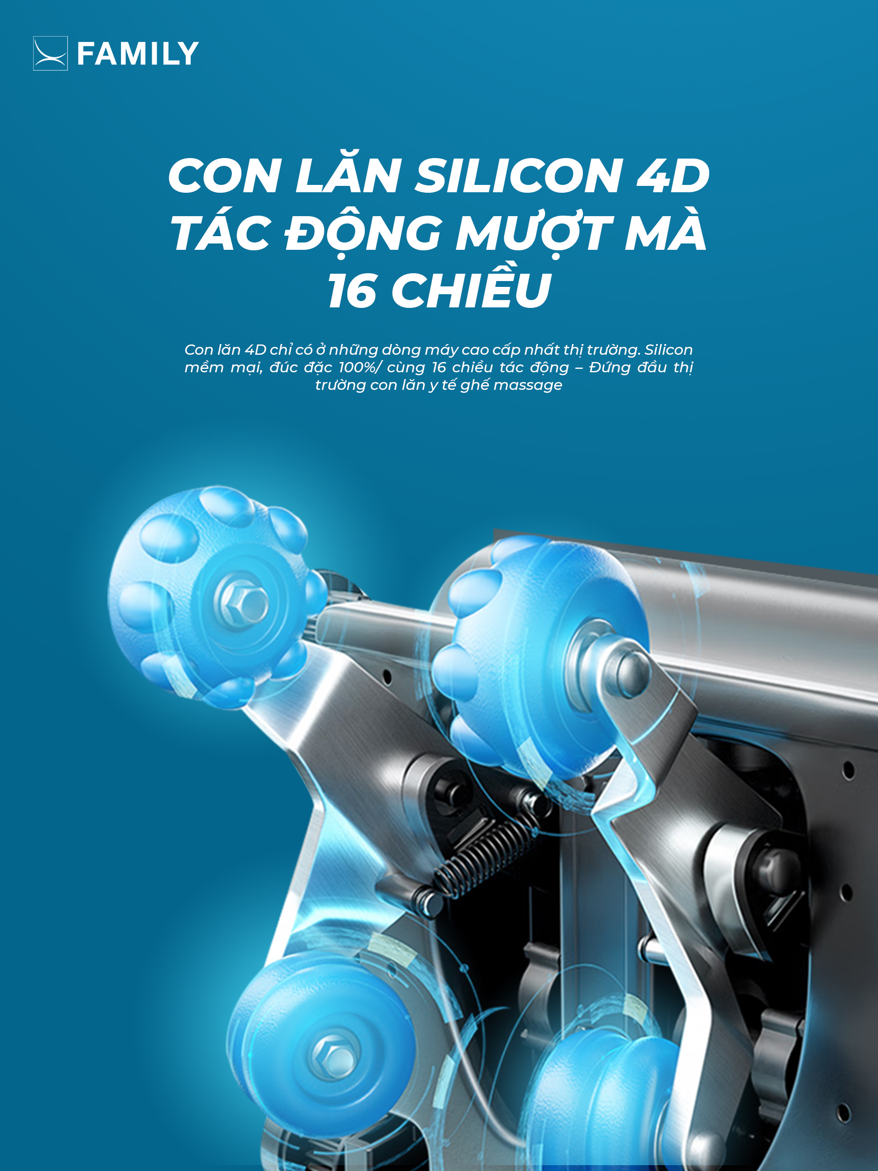 Ghế được thiết kế với 2 cụm con lăn massage từ hông lên đến cổ vai. Con lăn 4D silicon đúc đặc 100% bằng nguyên liệu cao cấp nhất. Massage 16 chiều chuyên sâu như mô phỏng chuyển động tay nghề của chuyên gia