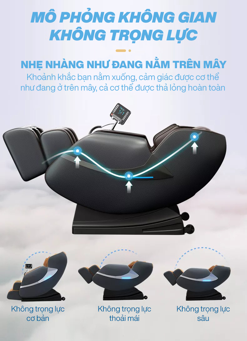 Trạng thái không trọng lực theo nghiên cứu của NASA Tư thế không trọng lực với góc nghiêng ngả tới hơn 130 độ giúp người sử dụng tiến vào trạng thái bồng bềnh, êm ái nhất. Không chỉ vậy, tư thế này còn giúp lượng máu lưu thông về tim và não tốt hơn, lá phổi mở rộng để nhận oxy nhiều hơn.