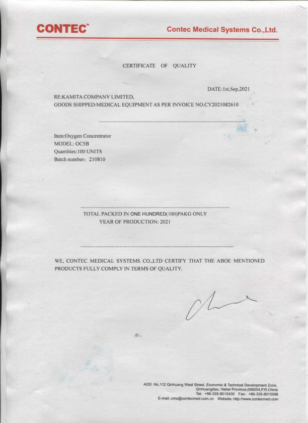 Giấy chứng nhận CO và CQ của Tập đoàn Y tế Contec cho sản phẩm Máy tạo oxy Y tế OC5B