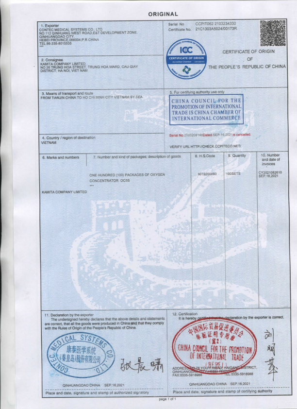 Giấy chứng nhận CO và CQ của Tập đoàn Y tế Contec cho sản phẩm Máy tạo oxy Y tế OC5B